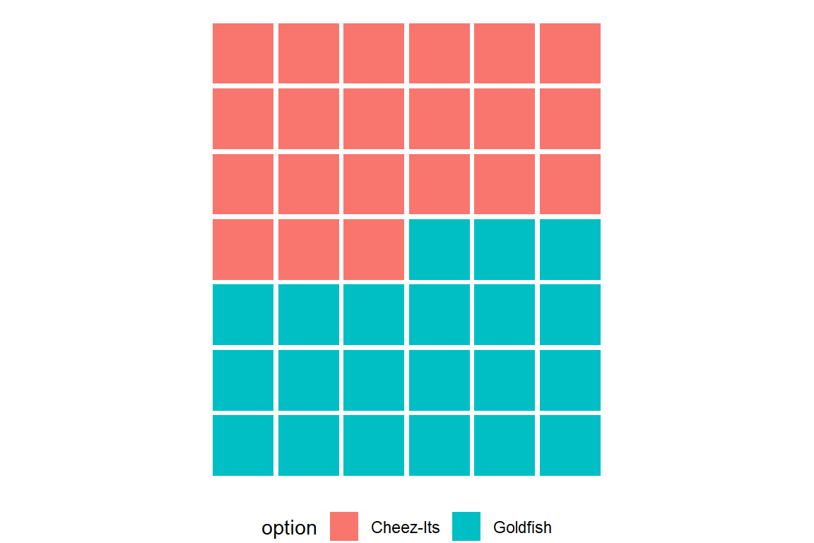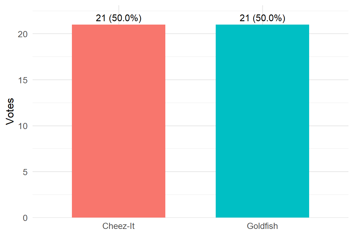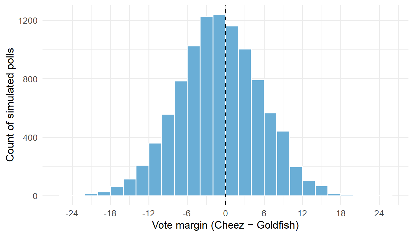 We can also express uncertainty for the vote-margin (Cheez-Its minus Goldfish share). Share margin = 2p - 1, the 95% CI for the margin is just 2 x CI(p) - 1: