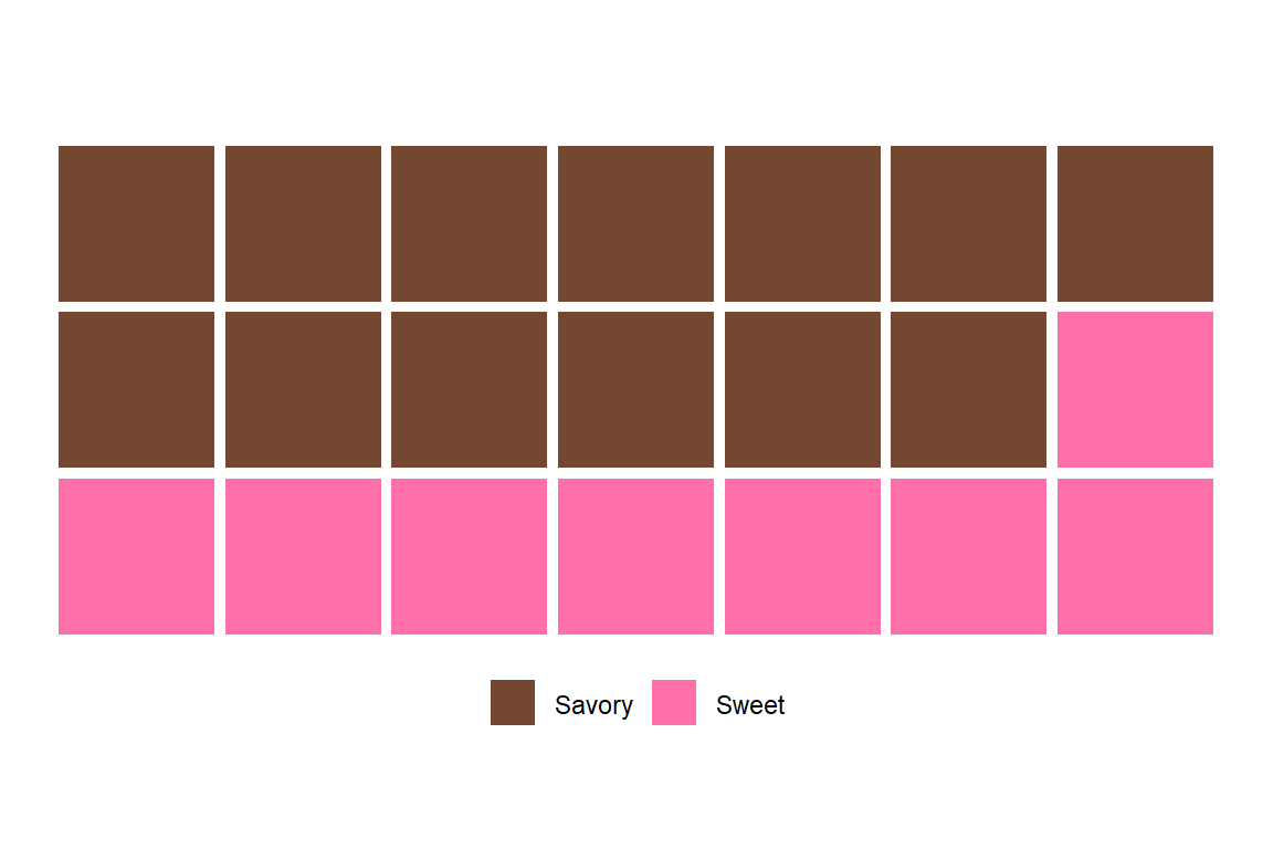 Sweet vs Savory (N = 21): Savory leads 13–8 (about 61.9% vs 38.1%).