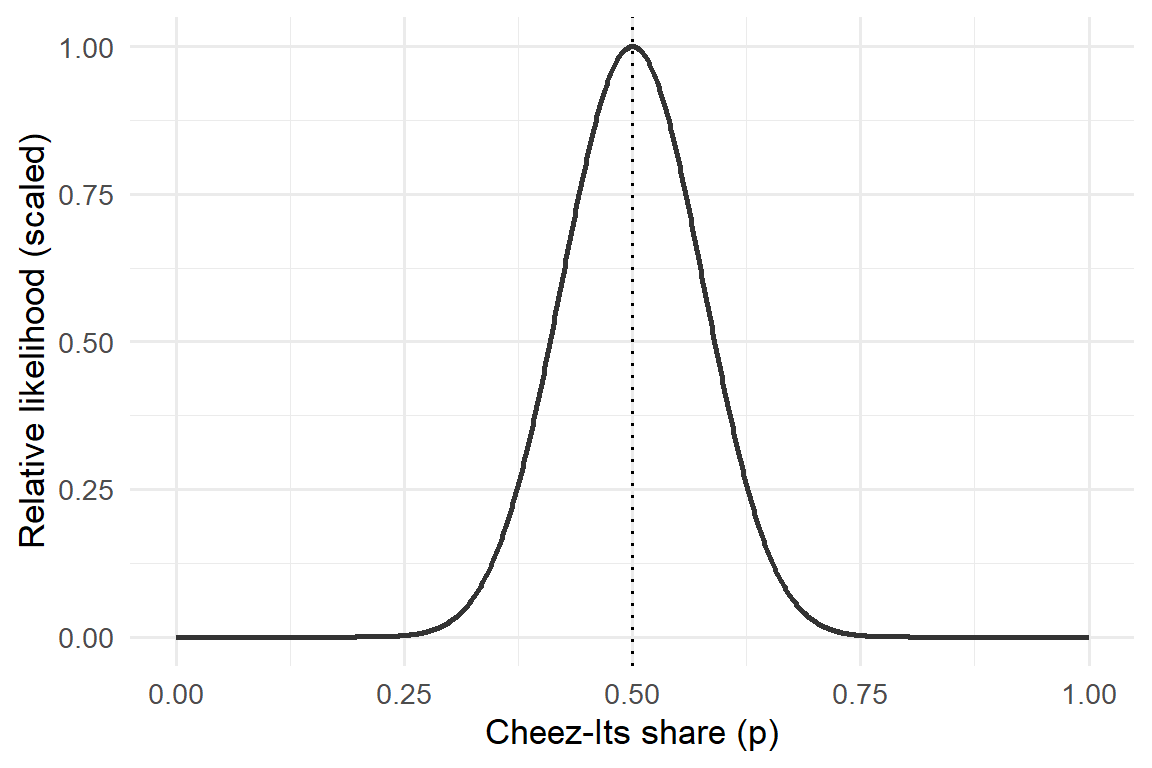 We can also express uncertainty for the vote-margin (Cheez-Its minus Goldfish share). Share margin = 2p - 1, the 95% CI for the margin is just 2 x CI(p) - 1: