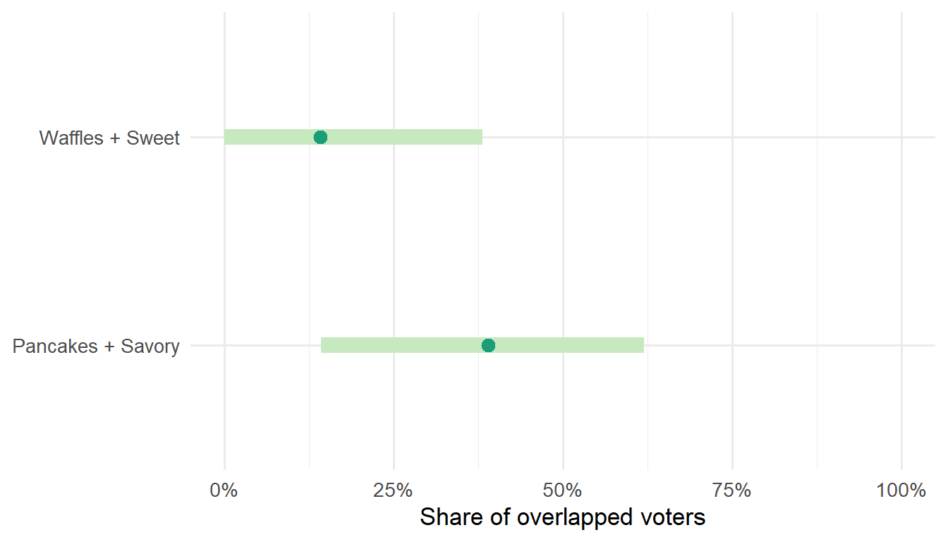 - Pancakes + Savory ≈ 39% of the overlapped voters (about 8 of 21)