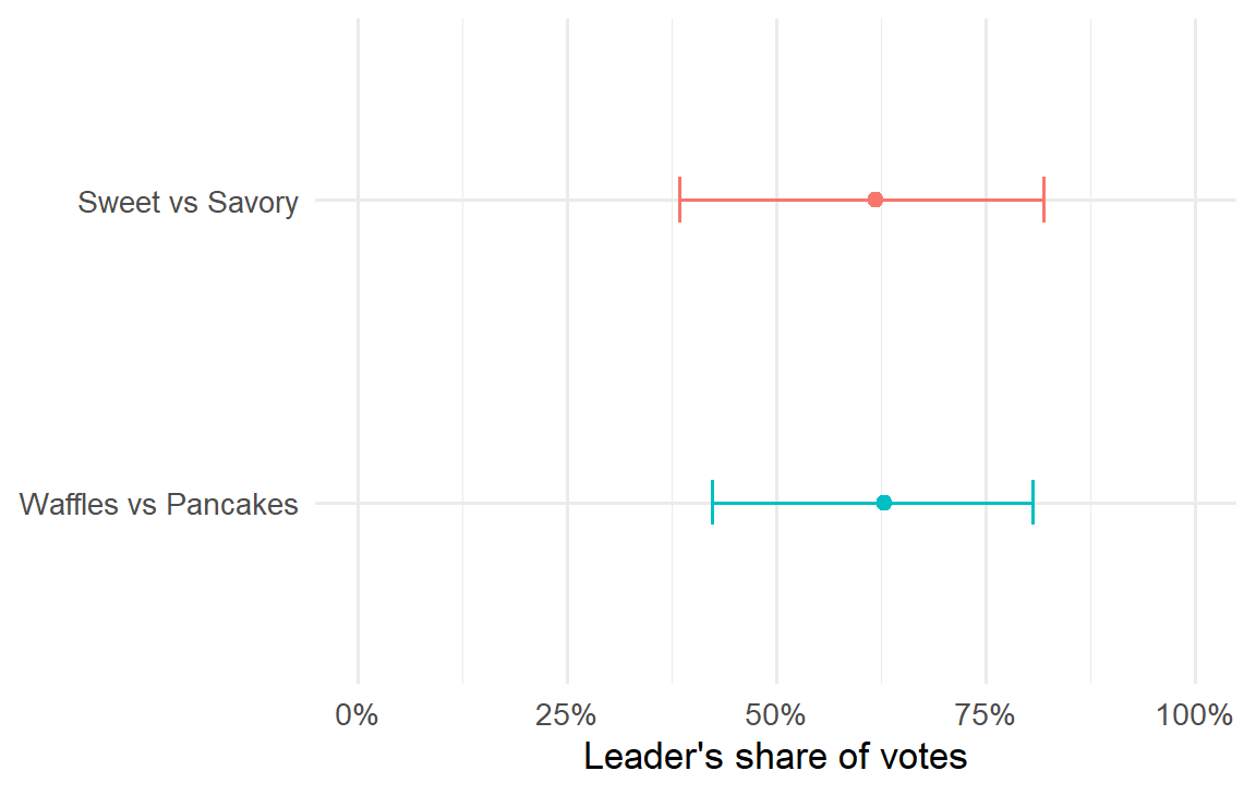Here’s a simple “leader share with 95% interval” for each question. It’s a quick way to see that both polls show a similar lean (roughly 60–65% for the winner).