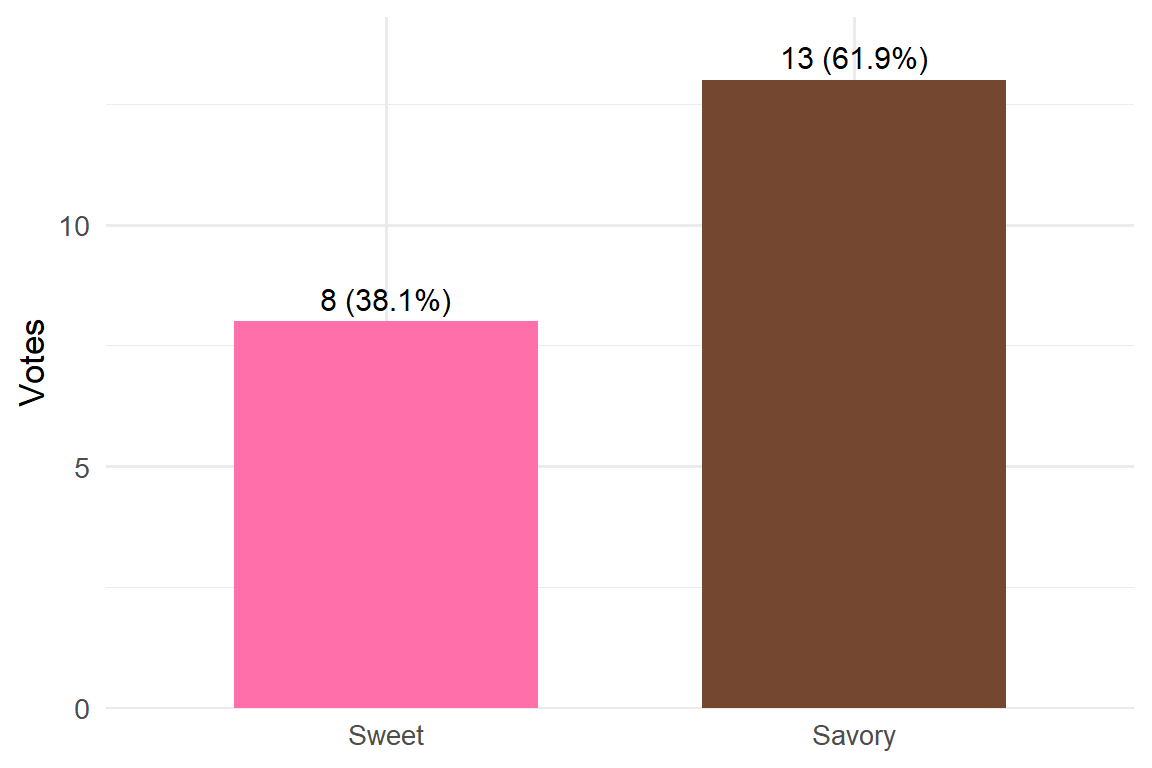 Sweet vs Savory (N = 21): Savory leads 13–8 (about 61.9% vs 38.1%).