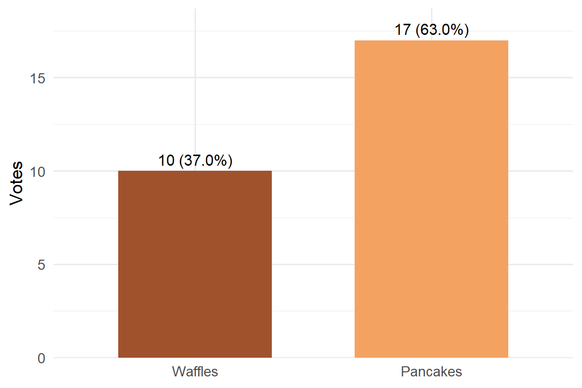 Waffles vs Pancakes (N = 27): Pancakes lead 17–10 (about 63.0% vs 37.0%).